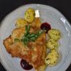 Z polskiej hodowli Grabinek z porem i parmezanem na puree z batat, z młodymi warzywami